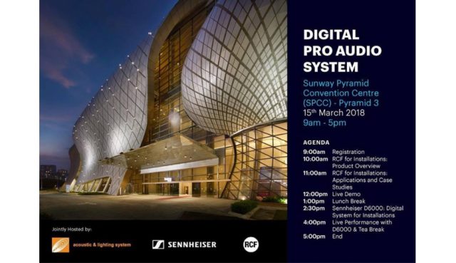 Want to know more about Digital Pro Audio System? Join us for the launching of RCF HDL30-A and Sennheiser Digital 6000 on 14th & 15th March 2018 at Sunway Pyramid Convention Centre (SPCC) – Pyramid 3.